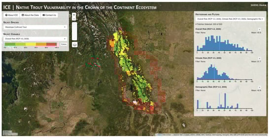 The second ICE application was developed for a climate change vulnerability assessment of two native trout species, bull trout and westslope cutthroat trout, in the CCE (http://ice.ecosheds.org/cce/; Figure 7). The design and functionality of this application was similar to the previous one except that it did not include spatial aggregation due to the smaller number of features, and it allows the user to switch between two separate datasets: one for each species. For each dataset, the main output variables included a set of risk scores associated with changes in habitat, demographics, genetics and climate, all of which were also combined into an overall risk score. Risk scores were computed for four future climate change scenarios (RCPs 4.5 and 8.5, years 2035 and 2075). The datasets also included a large number of input variables that were used to compute each risk score. These input variables included metrics related to the degree of hybridization, demographics, presence/absence, habitat availability and climate exposure, which was based on the output of a stream temperature model of the region.