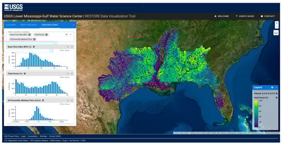 Screenshot of the ICE web application for streamflow conditions and alteration in the lower Mississippi-Gulf region showing the forest cover of each HUC12 basin pour point and crossfilters for the base-flow index, total percent forest cover and estimated median streamflow. Available at https://www.usgs.gov/apps/ecosheds/lmg-restore/.