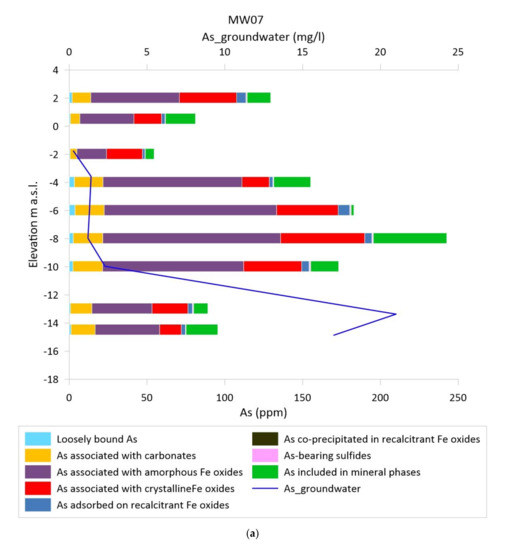 In the source area (MW07, left panel) the total As content in the sediments is generally high (>50 ppm), and it then continues to increase sharply with depth below the water table (located at ~0 m a.s.l.) down to −8 m a.s.l. At greater depths concentrations decrease to values comparable with those from the shallower aquifer sections. Nevertheless, as expected for the source zone, the As content in the sediments are along the entire depth profile higher than the background concentrations of about 15–20 ppm [58]. The comparison with extractable As profile also highlights that a percentage ranging between 76% and 99% of arsenic in soil is represented by potentially removable phases.