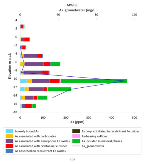 Both downgradient monitoring locations (MW08, MW09, Figure 4, middle and right panels) have similar As depth profiles; sediment As concentrations (total and extractable) in the vadose zone are comparable or lower than the background values [58], but they have high sediment As concentrations within the most permeable layer (−10 and −12 m a.s.l.). In these cases, the amounts of extractable As are smaller respect to the source zone reaching minimum values of 33% of removable As in the vadose zone of MW09 (Figure 4, right panel).