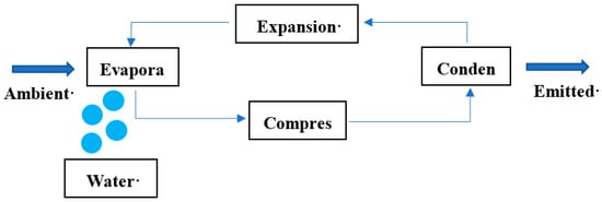 The air-into-water (Figure 2) process takes place as the air enters the AWG at ambient temperature. When it meets the evaporator, condensation occurs, and water is collected into the water tank. More specifically, from the evaporator, the vapor passes through a compressor where it reaches high pressure and temperature and condenses into a liquid state in the condenser by emitting the heat back into the environment. The expansion process occurs at the expansion valve where the temperature and pressure of the vapor decrease. The vapor enters the evaporator where evaporation occurs naturally due to the reduction in pressure, and when ambient air contacts the vapor, the cycle starts again.
