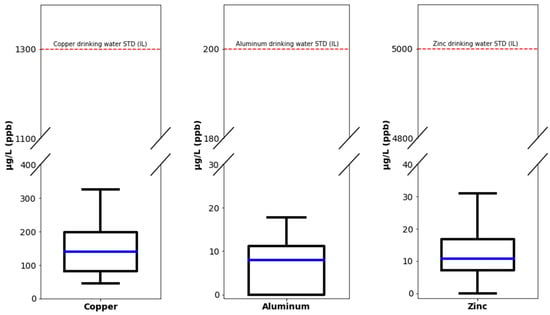 Levels of copper, aluminum, and zinc with comparison to drinking water standards. Note the break in the Y-axis scale. Blue line, median value; bottom and top frames, 25th (Q1) percentile and 75th (Q3) percentile, with the interquartile range (IQR) (the box) between them; bottom and top whiskers, Q1 − 1.5 × IQR and Q3 + 1.5 × IQR; dashed red line, minimal drinking water standard (between WHO and IL)(IL specified on Fig) for the specific metal.