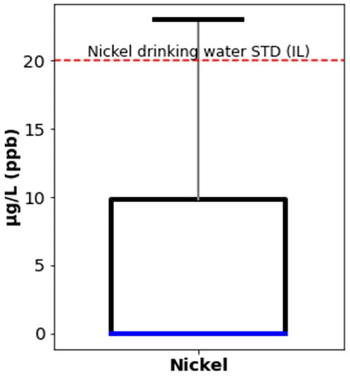 Nickel levels with comparison to drinking water standards. Blue line, median value; bottom and top frames, 25th (Q1) percentile and 75th (Q3) percentile, with the interquartile range (IQR) (the box) between them; bottom and top whiskers, Q1 − 1.5 × IQR and Q3 + 1.5 × IQR; dashed red line, minimal drinking water standard (between WHO and IL) (IL on Fig) for nickel.