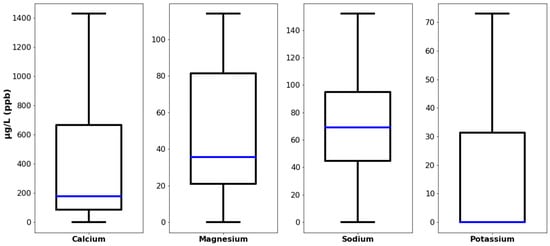 Levels of Ca2+, Mg2+, Na+, and K+ in dew water. Blue line, median value; the bottom and and top frames are the 25th (Q1) percentile and 75th (Q3) percentile, with the interquartile range (IQR) (the box) between them; bottom and top whiskers are defined as Q1 − 1.5 × IQR and Q3 + 1.5 × IQR.