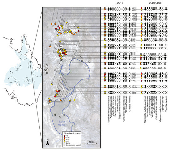 All springs in the Edgbaston Reserve portion of the Pelican Creek springs complex, showing springs as circles on a satellite image of the landscape. Springs are colour coded based on the number of species found in each spring in the 2015 sampling period. On the right, for both 2015 and the earlier 2006/2008 sampling period (Ponder et al. [18]), which species occupied each spring at that time (black = occupied, white = absent) for each species of snail endemic to the complex. Springs that were never found to contain snails are indicated, in white, on the map. The map of Australia has the major spring complexes of the Great Artesian Basin delimited with dotted lines.