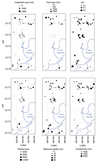 Close to a third of springs (27.3%) lack a pool (Figure 2), and most pools are small (mean pool size (Q1, Q3) = 334 m2 (6, 460)). Springs with large pools (>2000 m2) (Figure 2, centre) are primarily found in the north of the complex (Figure 3). Large pools are not necessarily deeper (R2 = 0.08), nor are they only found in springs with large vegetated area (both cases R2 = 0.5). Overall, spring pools at Edgbaston are shallow (all are <80 cm maximum depth), and the deeper springs (>10 cm) are found throughout the complex (Figure 3). There is a latitudinal conductivity gradient, with springs in the far south having lower conductivity than those in the north (possibly due to the influence of the large ephemeral Lake Mueller in the south-east of the property, see Figure 3), but the same cannot be said for pH (Figure 2).