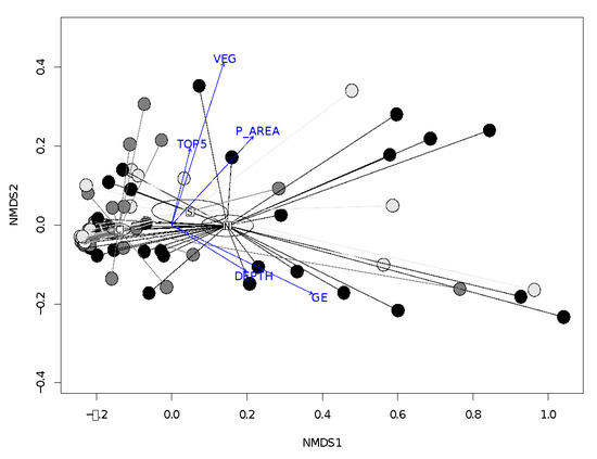 nMDS of a distance matrix calculated from the environmental characteristics of all springs at Edgbaston, colour coded for the latitudinal area of the complex they are within (black = north (latitude −22.71 to −22.725), dark grey = central (latitude −22.726 to −22.74) and light grey = south (latitude −22.75 to −22.76). Overlayed are the centroids (label position) and their standard errors (coloured ellipses). In blue, the significant environmental drivers of the spread of points in ordination space are displayed and are labelled by codes as follows: VEG = vegetated area (m2); TOP5 = average distance (m) to the five closest springs; P_AREA = pool area (m2); GE= wetted area (m2); DEPTH = maximum depth (mm).