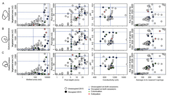 Bi-plots of the four types of environmental variables considered here: spring size (left, vegetated area and wetted area), pool characteristics (centre-left, pool area and maximum pool depth), pool water chemistry (centre-right, pH and conductivity) and isolation by Euclidean distance (right, average distance to closest 5 springs and to all springs). Overlaid on these bi-plots is the presence and absence (black and white) of three of the six focal species (A, Glyptophysa n. sp.; B, Gyraulus edgbastonensis; C, Gabbia fontana) and, for springs where samples are available, whether that spring is a site where the species has been recorded on both occasions (blue) or neither occasion (grey), or has been a site of a colonisation (green) or extirpation (red). Grey and blue lines represent the maximum and minimum value for all springs ever occupied (grey) and those occupied on both sampling occasions (blue).