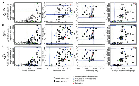 Bi-plots of the four types of environmental variables considered here: spring size (left, vegetated area and wetted area), pool characteristics (centre-left, pool area and maximum pool depth), pool water chemistry (centre-right, pH and conductivity) and isolation by Euclidean distance (right, average distance to closest 5 springs and to all springs). Overlaid on these bi-plots is the presence and absence (black and white) of three of the six focal species (A, Jardinella acuminate; B, Jardinella jesswiseae; C, Jardinella edgbastonensis) and, for springs where samples are available, whether that spring is a site where the species has been recorded on both occasions (blue) or neither occasion (grey), or has been a site of a colonisation (green) or extirpation (red). Grey and blue lines represent the maximum and minimum value for all springs ever occupied (grey) and those occupied on both sampling occasions (blue).