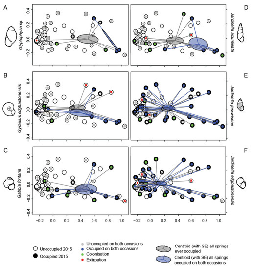 nMDS ordinations for each of the six focal species (A–F) showing all springs sampled at Edgbaston based on the dissimilarities in their environmental characteristics colour coded for whether the species was present or absent in the 2015 survey (black or white) and for springs where samples are available, whether that spring is a site where the species has been recorded on both occasions (blue) or neither occasion (grey), or has been a site of a colonisation (green) or extirpation (red). Ellipses represent the standard error of the centroid of either all springs ever occupied (grey) or all springs occupied on both sampling occasions (blue).