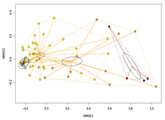 nMDS ordination showing all springs sampled at Edgbaston based on the dissimilarity in their environmental characteristics colour coded by four categories of species diversity: no species (white), species richness ≤2 composed of only widespread species (yellow), species richness between 3–6 composed of widespread species and at least one species that occupies few springs (orange) and species richness >6 comprising at least 3 species that occupy few springs (red). Ellipses for each of the diversity category represent the standard error of the centroid and for springs with no species (white) represents the 95% confidence interval.
