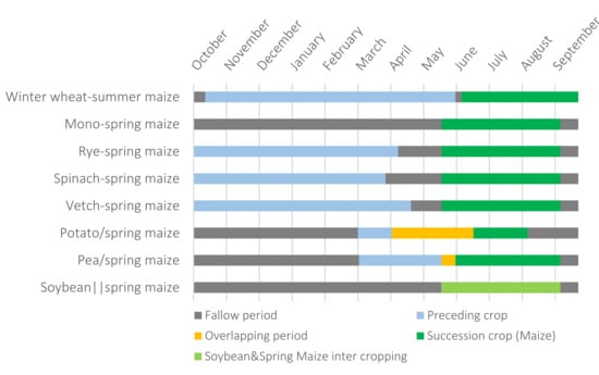 We intended to analyze the water consumption and food supply capacity of multiple cropping systems per hectare and per year (a completed planting year), respectively. The experiment adopted a randomized complete block design of multiple cropping systems. Rye (Secale cereal L.), spinach (Spinacia oleracea L.), vetch (Vicia villosa Roth.), potato (Solanum tuberosum L.), pea (Pisum sativum L.) and soybean (Glycine max (Linn.) Merr.), those crops with wide planting area and strong adaptability in the North China Plain, were selected to form rotation cropping, relay cropping and intercropping systems with spring maize (Zea mays L.). They were the rye–spring maize rotation cropping system, spinach–spring maize rotation cropping system, vetch–spring maize rotation cropping system, potato/spring maize relay cropping system, pea/spring maize relay cropping system and soybean||spring maize intercropping system. The winter wheat (Triticum aestivum L.)– summer maize (Zea mays L.) double cropping system and spring maize (Zea mays L.) mono-cropping system were the controls. There were 8 different treatments (including controls), and each treatment was repeated three times. Thus, there were 24 plots in total. Each plot area was 63 m2 (7 m × 9 m). The experiment record started in October 2015, and lasted for 3 years, namely the 2016 planting year (October 2015–September 2016), 2017 planting year (October 2016–September 2017), and 2018 planting year (October 2017–September 2018). Due to the weather, there might be a slight change in seeding date. The vetch was subject to broadcast sowing at the same time as rye, spinach and winter wheat. More specific field management information is available in previous research []. The crop growing periods are shown in Figure 1.