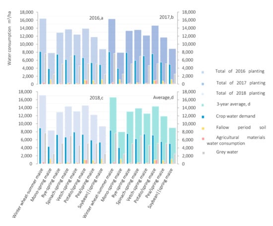 In order to make a more comprehensive and systematic accounting of cropping system water consumption, we combined fallow period evaporation and water consumption of agricultural materials (for example, pesticides, seeds, fertilizers, diesel, etc.) with green water, blue water and grey water in the water footprint. The sum of the green water and blue water represented the water requirement for crops. Green water referred to the crop water demand from the rainwater, blue water referred to the groundwater, in a nutshell. The evaporation of the fallow period was also considered since the assessment unit was the total water consumption of a planting year. The water demand of crops and the evaporation of the fallow period constituted infield water consumption. This evaluation also included the water that was consumed by making agricultural materials and grey water, so as to reveal the water consumption from the outfield. To sum up, the total water consumption included: