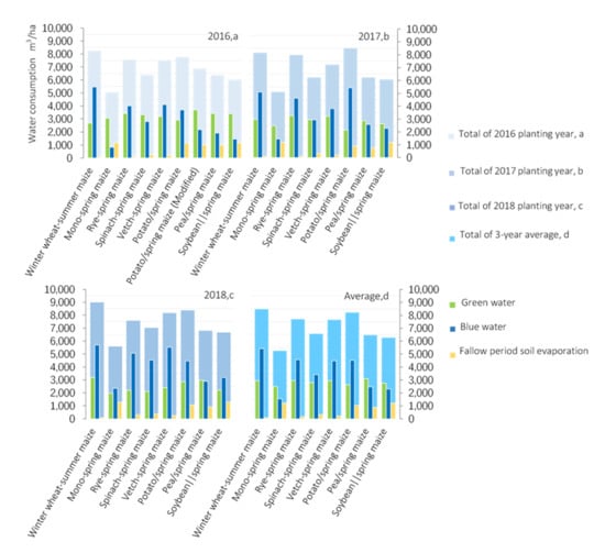 The results indicated that the winter wheat–summer maize system had the largest water consumption (Figure 2). On average, the total water consumption of the winter wheat–summer maize system was 16,585 m3/ha, followed by the potato/spring maize, spinach–spring maize, rye–spring maize, vetch–spring maize, pea/spring maize, soybean||spring maize and mono-spring maize cropping system. The other cropping systems’ water consumptions were 86.45%, 83.45%, 78.55%, 75.58%, 71.58%, 54.12%, 48.04% of the winter wheat–summer maize system, respectively.