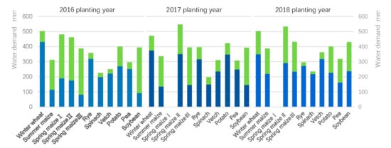 The water requirement and its composition of crops. Spring maize I represents the maize planted in vetch–spring maize plots in the 2016 planting year, the sowing date was 9 April. Its sowing date in the 2017 and 2018 planting years was the same as spring maize III. Spring maize II is the maize of the potato/spring maize cropping system, the sowing date was usually earlier than the other spring maize. Spring maize III represents the maize in other cropping systems, they had the same sowing date in the middle of May.