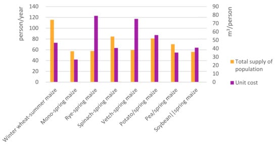 The feeding population of multiple cropping systems and their water consumption for a single person. In the soybean–spring maize cropping system, soybeans were treated as green manure, which did not have contribution to the yield. However, maize yield had been slightly affected.