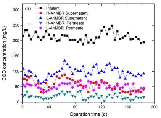 COD removal efficiency is an important indicator to evaluate the treatment performance of wastewater. The COD concentrations in the influents, supernatants and permeates of H-AnMBR and L-AnMBR during the whole operation period are shown in Figure 4a. The average COD value in the influent was 212.61 mg/L, while the permeate COD values were 18.94 and 51.09 mg/L for the H-AnMBR and L-AnMBR, respectively. The average COD removal efficiencies were about 91.09% and 75.97% on average for the H-AnMBR and L-AnMBR, respectively. The permeate from the L-AnMBR presented a higher COD compared with the permeate from the H-AnMBR. The COD content in the L-AnMBR permeate was higher due to the accumulation of VFA, and there were more solubilized organic components that were not transformed into methane and left the system.