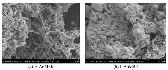 SEM was used to characterize the microscopic morphology of sludge, as shown in Figure 7. It can be seen that the sludge flocs of H-AnMBR contained more bacillus and the sludge particles were loose, while L-AnMBR contained more coccus and the sludge particles were compact and small. Compared with L-FOMBR, H-FOMBR contained more fine sludge flocs, which is consistent with the floc morphology analysis results of the previous section.