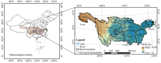 The Yangtze River basin (90°33′ E∼122°25′ E, 24°30′ N∼35°45′ N) is the third largest basin in the world (Figure 1), and covers 18.8% of the land area, and one third of the total population, of China []. The Yangtze River basin has a large number of rivers and lakes, a developed economy, and rich resources. Within the basin, the Dongting Lake Plain, Yangtze River Delta Plain, Poyang Lake Plain, and Han River Plain are the main grain producing areas in China. Precipitation in the Yangtze River basin is greater in the southeast and less in the northwest, and the temperature is higher in the east and lower in the west. Within the basin, the Yunnan-Guizhou Plateau, Sichuan Basin, and Jinshajiang River Valley are closed, high-temperature areas under the influence of the topography []. The Yangtze River basin is vulnerable to drought and flood disasters. From 1961 to 1990, the losses caused by drought and flood disasters accounted for about 78% of the total losses, caused by meteorological disasters in the Yangtze River basin, while losses caused by drought alone were as high as 50% [].
