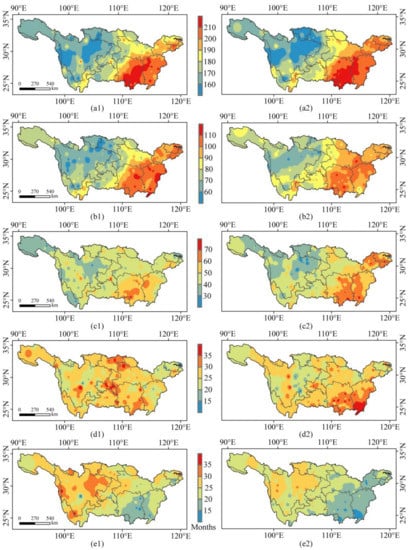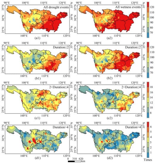 Areas with more than 25 severely dry and wet months are widely distributed in the whole basin (Figure 2(d1,d2)), indicating that the probability of severe drought and wetness events in the whole basin was relatively close. For extreme dry and wet months (Figure 2(e1,e2)), although the overall frequency of months was relatively small, the relatively frequent occurrences were mainly located in the upper reaches of the Yangtze River, with relatively few occurrences in the middle and lower reaches of the Yangtze River. Furthermore, Figure 3 shows that short duration events occurred in the middle and lower reaches of the Yangtze River, while long duration events occurred in central and eastern Sichuan, southern Chongqing, and northern Yunnan, which also explained the coexistence of drought and wetness in the Yangtze River basin. However, Figure 3 shows that there are more drought and wetness events with short duration occurring in the Yangtze River basin.