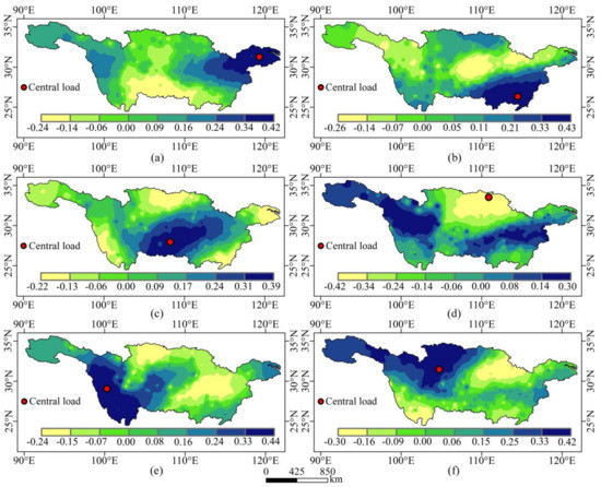 The EOF eigenvectors of the first six significant patterns were orthogonally rotated, so that the loads with similar change characteristics could be gathered in space. IDW spatial interpolation of the rotated load (Figure 4) shows that the high positive value of load in pattern 1 is higher than the absolute value of the high negative value, and the central load (the load with the highest absolute value) is located in the east of the Yangtze River basin (Figure 4a), so pattern 1 can be named as the eastern pattern (Table 3). The high positive load value region of pattern 2 is located in the southeast of the Yangtze River basin, and the central load of the pattern is located in the southeast of the Yangtze River basin. Therefore, pattern 2 can be called the Southeastern pattern (Figure 4b). Similarly, patterns 3, 5, and 6 can be called the Southern, Southwestern, and Northwestern patterns, respectively. The difference is that the high negative load value of pattern 4 is higher than the high positive load value. The central load is located in the northern part of the Yangtze River basin, where the high negative load value is located, therefore, this pattern can be called the northern pattern (Figure 4d).