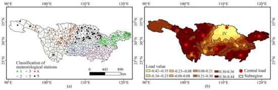 The spatial distribution of (a) the Tyson polygon classification of meteorological stations, and (b) classified load value and feature area extraction.