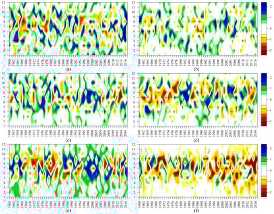 Figure 6 shows the year–month distribution characteristics of the SPEI values of the central load meteorological stations of the REOF significant patterns in the Yangtze River Basin from 1960 to 2017. Drought in subregion I–V mainly occurred from April to November (Figure 6), and the higher magnitude droughts mainly occurred from May to September. Although the distribution of wet months was wider than that of dry months, the months with higher wetness magnitude still mainly occurred from May to September. Generally speaking, subregion VI was more arid than the other subregions, and extreme drought was prone to occur from May to October.