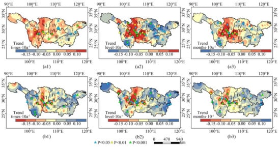 Figure 7 shows the spatial distribution of changing tendency from 1960 to 2017. In terms of the occurrence times, the OTD increased significantly (Figure 7(a1)), and the OTW decreased significantly (Figure 7(b1)), in the western part of subregion III and the southern part of subregion VI, indicating that this region is gradually becoming arid. In other subregions, except for the OTD in the southern part of subregion I that showed a significant decreasing trend, both the OTD and OTW were on an increasing trend, leading to more frequent droughts and floods (Figure 6).