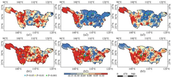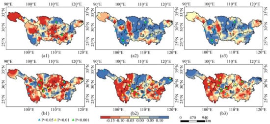 The spatial distribution of the linear trend of (a1) OTW from 1960 to 1988, (a2) WI from 1960 to 1988, (a3) WD from 1960 to 1988, (b1) OTW from 1989 to 2017, (b2) WI from 1989 to 2017, and (b3) WD from 1989 to 2017.