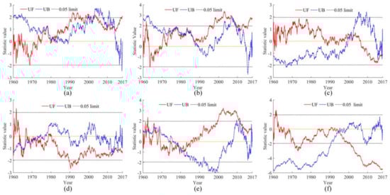 The Mann–Kendal (M–K) abrupt test [,] is generally used for climate abrupt detection. UF and UB (forward and backward of the sequential values of the statistic U, see, e.g., Yang, Y.; and Tian, F., 2009 []) are used for time series analysis when UF >0 or <0, the sequence shows a trend of increase/decrease, and the curve UF exceeds the reliability line (P < 0.05), indicating a significant trend of change. If the intersection of UF and UB is located between the reliability lines, this point is the beginning of the abrupt transition. In this study, the M–K abrupt test was used to detect the abruptness of the rotated principal component time series (RPCs).