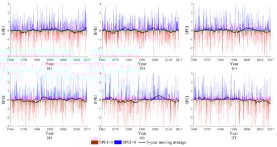 The 5-year moving average of central load SPEI of (a) subregion I, (b) subregion II, (c) subregion III, (d) subregion IV, (e) subregion V, and (f) subregion VI.
