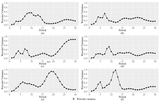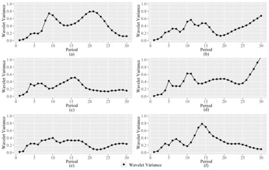 Morlet wavelet variance of DI in (a) subregion I, (b) subregion II, (c) subregion III, (d) subregion IV, (e) subregion V, and (f) subregion VI.