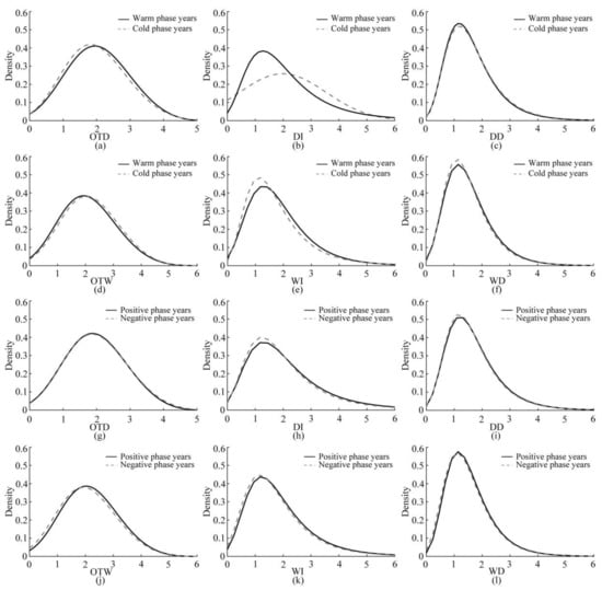 The generalized extreme value distribution (GEVD) is a continuous probability distribution based on extreme value theory. The advantage of GEVD is that the probability density function (PDF) can be estimated without making any assumptions about the unknown distribution. Moreover, GEVD has good flexibility in dealing with the tails of different types of distributions [], and can be well used for the description of meteorological elements. In this study, GEVD was used to show the distribution of OTD, DI, DD, OTW, WI, and WD, when ENSO is in a cold/warm phase, and AO is in a positive/negative phase.