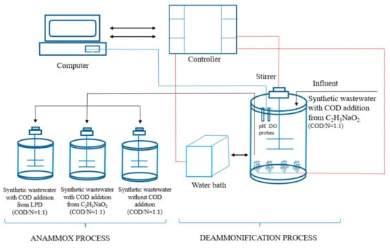The laboratory scale system used in this study consisted of one 10 dm3 SBR in the deammonification mode and three batch reactors in the anammox mode laid out according to the scheme in Figure 1. The SBR was equipped with a thermostatic jacket maintaining a constant temperature in the range of −35 to +200 °C with an accuracy of ±0.1 °C. The main reactor metered service probes were placed to measure pH (Endress + Hauser EH CPS 471D-7211, Switzerland) and measure dissolved oxygen (Endress + Hauser COS22D-10P3/O, Germany).