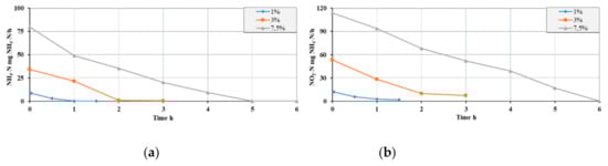 It is also worth paying attention to the time needed for the complete oxidation of NH4-N in R1. When the LPD addition was 1%, NH4-N was completely oxidized in 1.5 h. When the LPD addition was 3%, NH4-N was completely oxidized in 3 h, and when the LPD addition was 7.5%, NH4-N was completely oxidized in 6 h. Thus, it turns out that the reaction time increases with the increase in proportion of digestate added (see Figure 4a). This is also indicated by the decrease in NO2-N concentration in individual cases (see Figure 4b) and is due to the increased amount of NH4-N needed to be oxidized.