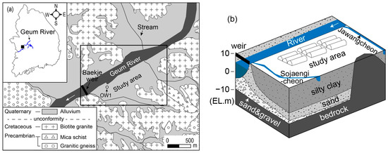 (a) Location and geological map of the study region in the Geum River Basin, South Korea (modified from [30]); (b) Characteristics of the alluvial successions.