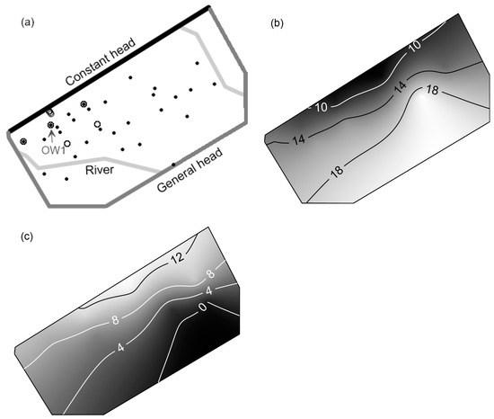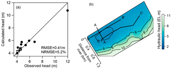 The steady-state model was calibrated to groundwater levels from 29 monitoring wells when the river level was 4.2 m (Figure 3a). The calibration was carried out by trial and error, wherein the model parameters were calibrated until the fit between the calculated and observed heads was suitable. The developed model was calibrated by changing the hydraulic conductivity value in the sand and gravel layers, and the conductance of the hinterland.