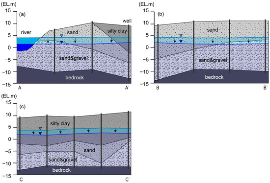 Conceptual figure of the groundwater level changes in the alluvial aquifer resulting from weir operation with the geological cross-section. (a) A–A`; (b) B–B` in the riverside land; (c) C–C` in the protected lowland.