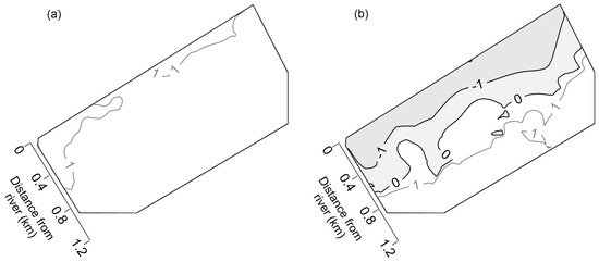 Simulated results incorporating the spatial variation of pumping available thickness (PAT) values when the river level is (a) 4.2 m and (b) 1.4 m, respectively.