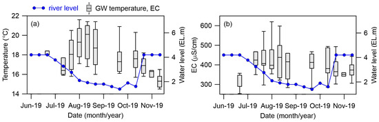 Changes in (a) groundwater temperature and (b) Electrical conductivity (EC) (box-whisker plots) with the river level variation (point) during weir operation.
