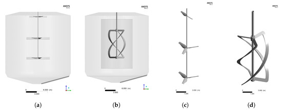 Anaerobic Digesters (AD) reactor simulation geometry with the (a) SCABA and (b) helical ribbon agitators and computer-aided design files of the (c) SCABA and (d) helical agitators. The cylindrical reactor is based on the Rossau wastewater treatment plant AD, Innsbruck, with radii of 1.5 m, 8.5 m, 9.1 m, 9.1 m and 6 m from the base at respective heights of 0 m, 1.9 m, 3.1 m, 19.1 m, and 20.1 m.