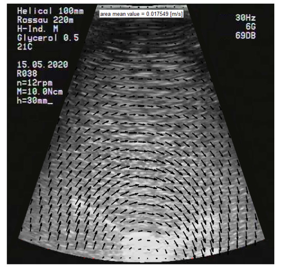 Polyamide tracer particles were added to the fluid in order to improve data quality by increasing the number of density transitions which are detected by the ultrasonic device. The nearly massless particles had a mean diameter of 0.005 with almost zero buoyancy, such that they travelled with the fluid flow. The changes in the ultrasound waves that were generated by these particles can then be solved and tracked homogeneously in the fluid to generate a velocity vector field. The gathered ultrasonic frames were evaluated by cross-correlation using PIVLab with a FFT window deformation algorithm with incrementing sequencing style [21]. Every radial and tangential particle shift is computed for at least 1000 frames; shifts along the height or vertical directions are not considered with this measuring approach. The measuring process is conducted in increments of 0.01 m along the reactor height starting at 0.03 m. An example of the PIVLab evaluation is illustrated in Figure 2 for the helical device with a 50/50 wt% glycerol-water mixture at a reactor height of 0.03 m; the region of interest is the whole two-dimensional (2D) sliced flow field. The absolute average velocity is computed using the single translocation of the particles as well as the time interval between the single frames. Therefore, the ultrasonic measurement is restricted in terms of flow velocity due to a sampling rate of 24 Hz and associated aliasing effects at higher rotational speeds. The time averaged velocity values were computed over all measured frames to be compared with CFD data and, therefore, measurement intervals were set to ensure that at least a minimum of 1000 frames were considered per experimental setup. For validation, CFD simulations representing the same experimental setup were conducted. In the lab-scale CFD simulations, Newtonian behaviour was set with constant viscosity in order to better represent the glycerol-water mixtures used in the experimental setup.