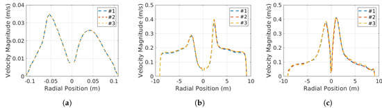 Velocity magnitude profile along the AD reactor diameter at a height of 0.12 m for the lab-scale with the SCABA agitator (a) and at a height of 10 m for the helical (b) and SCABA (c) agitators; comparing the three finest grids.