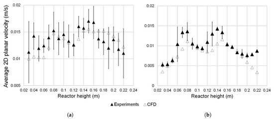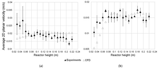 Average 2D plane velocities of the experimental data and computational fluid dynamics (CFD) simulations for a rotational speed of 12 rpm and at height intervals of 0.01 m for the SCABA device with pure water (a) and a 75/25 wt% glycerol-water mixture (b).