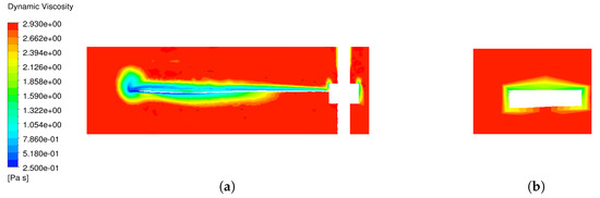 Viscosity profiles near the blades of the SCABA (a) and helical (b) agitators at a TS concentration of 12.1% using the capped power-law model.