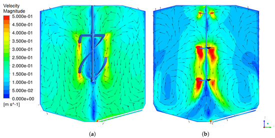 Contour and normalised vector plots of the velocity magnitude for the helical (a) and SCABA (b) agitators at a TS concentration of 7.5%.