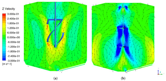 Contour and normalised vector plots of the z velocity for the helical (a) and SCABA (b) agitators at a TS concentration of 7.5%.