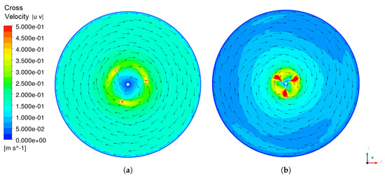 Contour and normalised vector plots of the cross velocities, |u + v|, for the helical (a) and SCABA (b) agitators at a height of 12.75m from the bottom at a TS concentration of 7.5%.