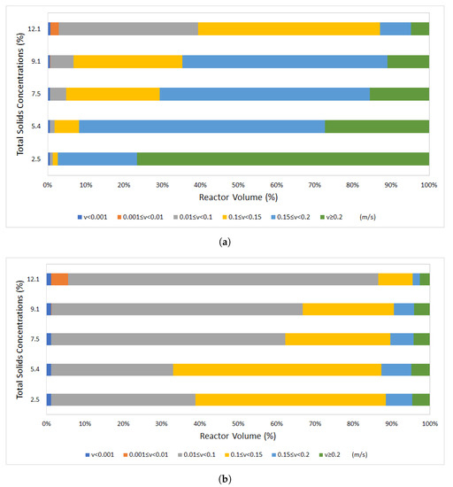 In this section, we will analyse the velocity contributions of the two agitators in the same reactor, as illustrated in Figure 10, in order to understand and assess the mixing capabilities of the generated flow fields of the two agitators at various TS concentrations. For the helical agitator, velocities m/s contribute to 60–98% of the reactor volume across varying TS concentrations. In comparison, the same velocities only contribute between 12–67% of the reactor volume for the SCABA agitator and the best SCABA velocity contribution profile, TS 5.4%, is only slightly better than the worst case helical profile at TS 12.1%.