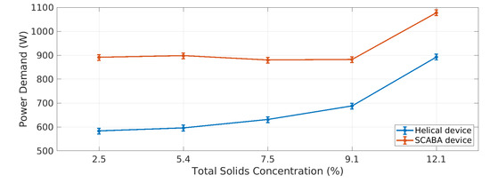 Overall, the observed faster hydrodynamic flow field in Figure 7 that is induced by the far field design of the helical device results in significantly better velocity contributions and, therefore, improved mixing potential in the reactor compared with the SCABA agitator. However, both agitator designs for all TS concentrations satisfy the minimum mixing level criteria that velocities must occupy less than 15% of the reactor volume [2], which implies that both designs would be appropriate for stirring the sludge in ADs for all TS concentrations. From these results, we can conclude that the generated flow field from the helical agitator produces an improved stirred reactor compared with the SCABA agitator. However, in order to properly assess the two designs we need to consider the power demand required to generate the flow field for each agitator; this is explored in the next section.